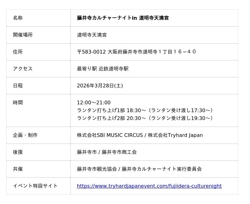 株式会社SBI MUSIC CIRCUS、(本社:東京都港区、代表取締役社長:大付 楽洋、以下「当社」)は、藤井寺市観光協会および藤井寺カルチャーナイト実行委員会とともに、大阪府藤井寺市の道明寺天満宮で2026年3月28日(土)に開催する、「藤井寺カルチャーナイト in 道明寺天満宮」の入場前売りチケットの発売が開始されたことをお知らせいたします。