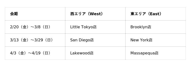 本企画は、各店舗の会期に合わせて以下の通り順次展開。