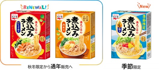 株式会社 永谷園(社長:掛谷 浩志、東京都港区)は、「寒くなった時の鍋の定番」としてご愛顧いただいている「煮込みラーメン しょうゆ味」「同 みそ味」を、季節を問わずお楽しみいただくために通年販売し、さらに季節ならではの味わいとして春夏季節限定メニュー「煮込みラーメン ごま油香る塩味」(希望小売価格・税抜各430円)を2026年3月2日(月)より新発売いたします。
