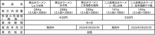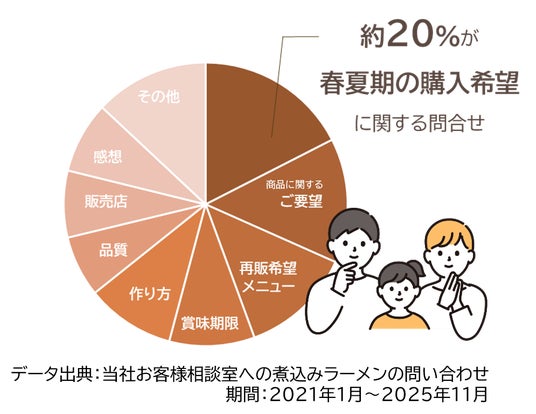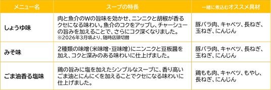 「煮込みラーメン」は冬の定番商品ですが、「春夏も食べたい」というご要望を多数いただいています。そこで今期から、定番で人気のしょうゆ味・みそ味の通年販売を開始します。また、夏向けに「ごま油香る塩味」も新登場し、さっぱりとした味わいもお楽しみいただけます。