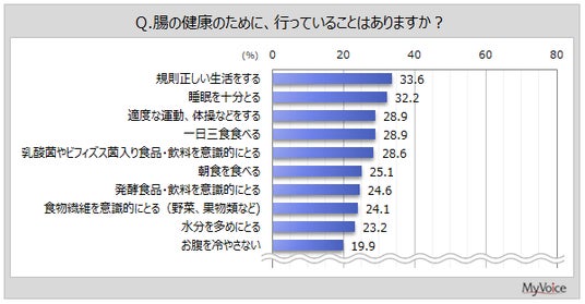 腸の健康のために行っていることは(複数回答)、「規則正しい生活をする」「睡眠を十分とる」が各3割強、「適度な運動、体操などをする」「一日三食食べる」「乳酸菌やビフィズス菌入り食品・飲料を意識的にとる」が各3割弱となっています。
