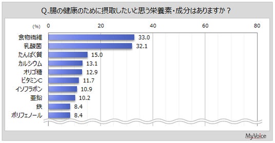 ■腸の健康のために摂取したい栄養素・成分は「食物繊維」「乳酸菌」が各3割強、「たんぱく質」が15%