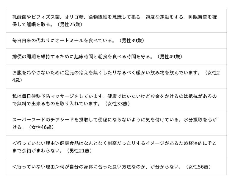 腸の不調をよく感じる層では、「乳酸菌やビフィズス菌入り食品・飲料を意識的にとる」「規則正しい生活をする」「睡眠を十分とる」「水分を多めにとる」「お腹を冷やさない」などが上位となっています。