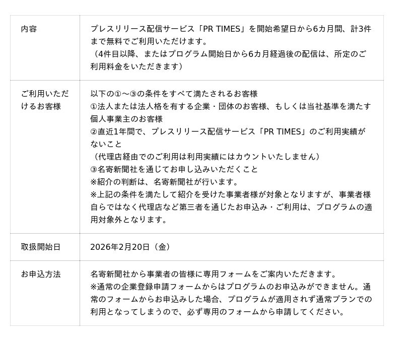 名寄新聞社が紹介する事業者に対し、各事業者がそれぞれ開始を希望する日から6カ月間、計3件まで無料で「PR TIMES」でプレスリリース配信いただける「名寄新聞プログラム」を提供します。