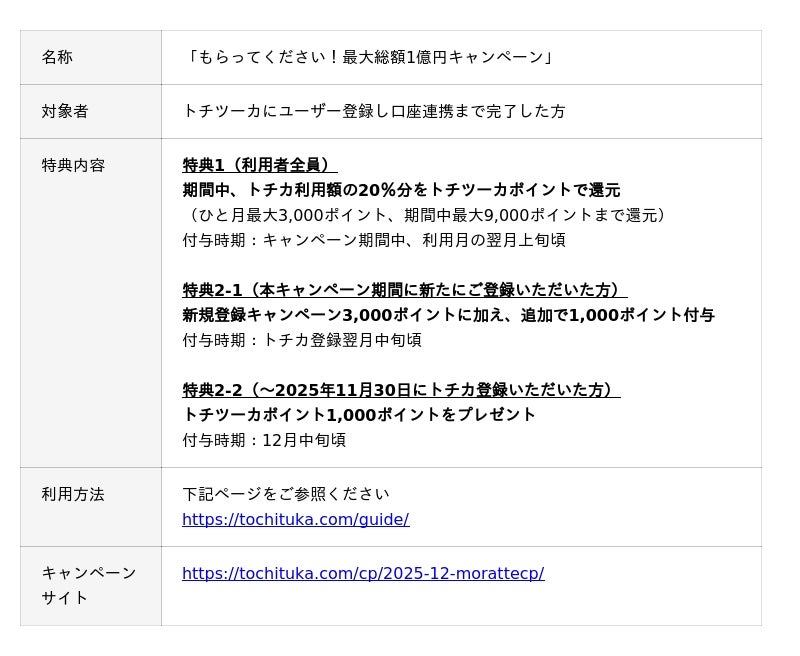 現在実施中の「もらってください!最大総額1億円キャンペーン」では、トチツーカにご登録のうえ口座連携まで完了された方を対象に、ポイント進呈を行っており、2026年2月28日(土)まで実施中です。