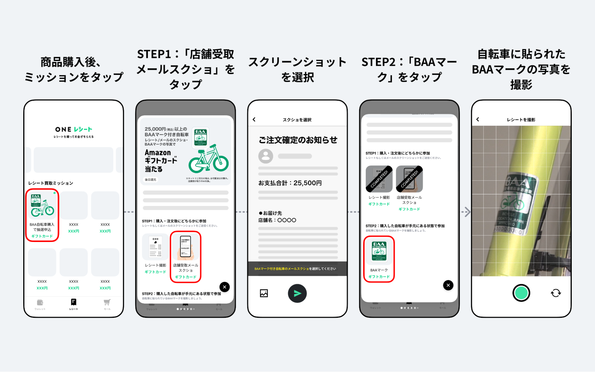 購入日(注文日)、商品名、金額、購入店舗名(受取店舗名)、注文番号(オンライン購入の場合)が一括かつ視認できる購入時のレシートの写真と、BAAマークが写るアングルで撮影した購入自転車の写真をONEに投稿し、応募完了