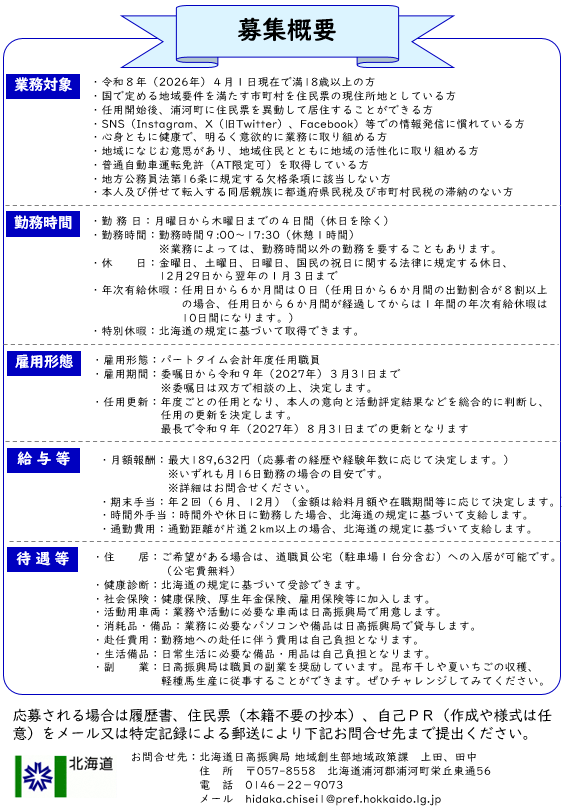 令和8年(2026年)3月16日(月)午後5時までに日高振興局地域政策課へ必要書類(履歴書、