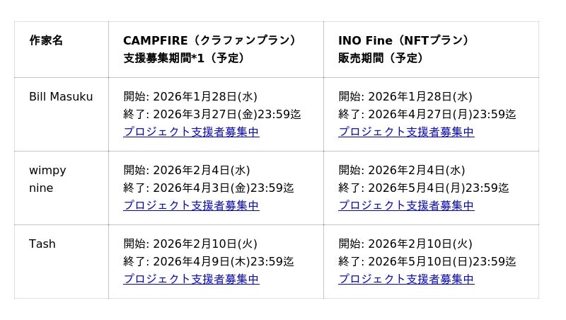 本プロジェクトは、クラウドファンディングサイトCAMPFIREとNFT販売を行うZaif INO特設サイトで支援者の募集スケジュールが異なります。