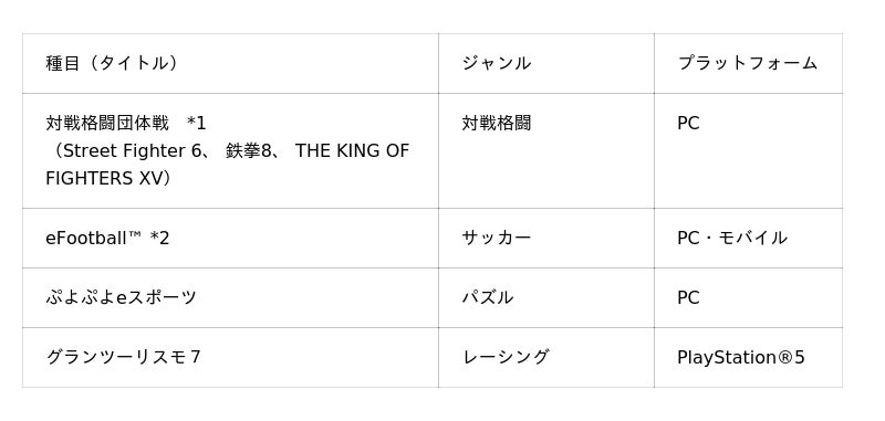 「Street Fighter 6」、「eFootball(TM)」、「グランツーリスモ7」の出場選手については、現在、大会等による選考を準備しています。決定次第お知らせしていきますので、引き続きご注目ください。