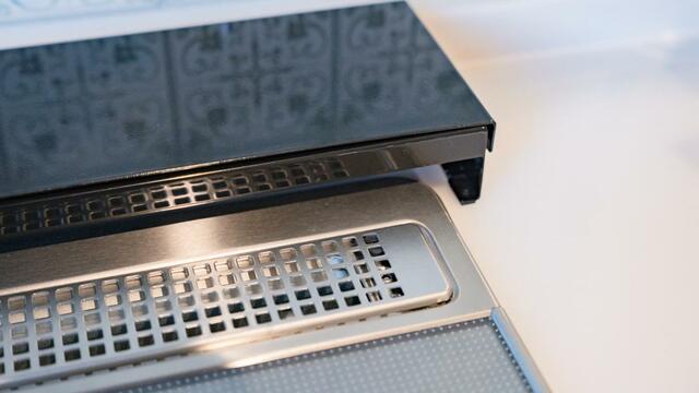 排気口カバーを最大限広げた状態でも、フラットなので小さな鍋の一時置きとしても使えます。