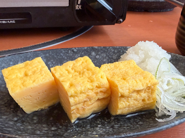 さと式焼肉では様々な一品料理も頼めます。筆者は大好物の「出汁たっぷり」の出汁巻きを頼んで、お肉と野菜ループの合間の箸休めに。
