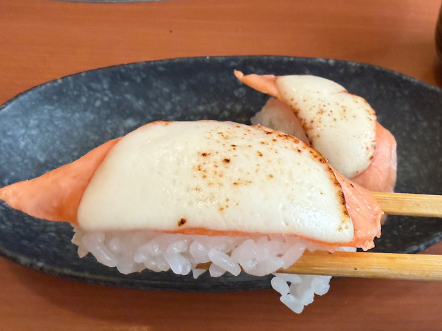 さらにさらに、炙りチーズ寿司も食べ放題メニューに含まれているという神仕様! 筆者はサーモンチーズ炙り寿司を頼んでみました。
