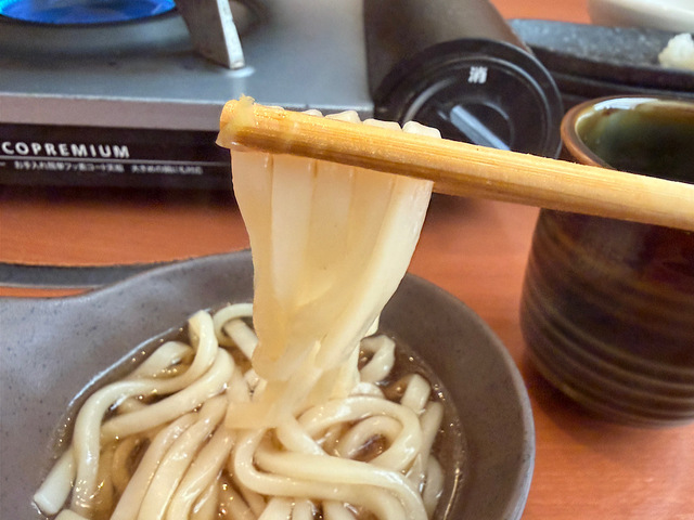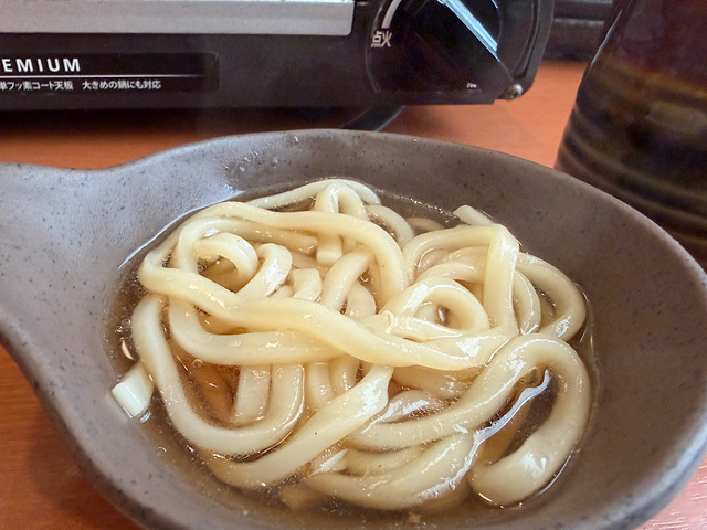お腹がいっぱいになってきた頃に締めのうどんが茹で上がったので、食べていきましょう。