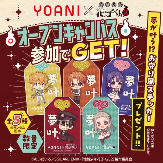 期間中、代々木アニメーション学院のオープンキャンパスにご参加いただいた方を対象に、【数量限定】「夢が叶う!?お守り風ステッカー」をプレゼントします。TVアニメ『地縛少年花子くん2』の人気キャラクターを用いたお守り風デザインのステッカーは、スマートフォンケースにも挟めるサイズで、日常的に持ち歩きやすい仕様です。
