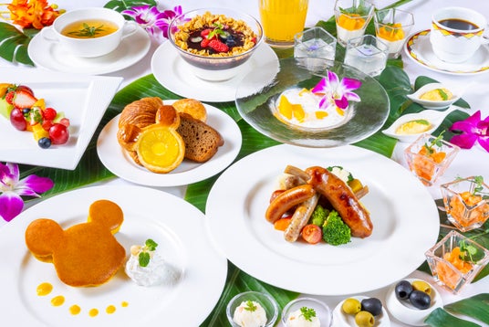 ディズニーアンバサダーホテルにご宿泊の方だけがご利用いただける、ハワイアンスタイル・ブレックファストブッフェwithスティッチでは、ミッキーマウスと、ディズニー映画『リロ&スティッチ』に登場するスティッチがゲストの皆さまのテーブルを訪れます。