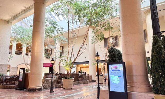 中央のエリアには、大きな吹き抜けがあり、本物のベンジャミンが高い天井まで育っています。街灯や窓のデザインからヨーロッパの歴史も感じられ、ヨーロッパの街に訪れたような気分になりました。
