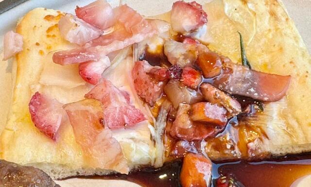 いちごの甘酸っぱさとベーコンの塩味、バルサミコ酢の酸味が絶妙にマッチした一品です。クリーム色の生地にピンクのいちごが見た目もきれいで、心おどりました。