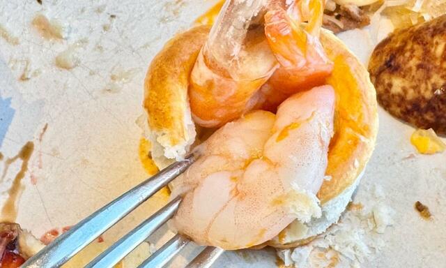 サクサクのパイでできた器の中に、エビが丸々2尾盛り付けられています。濃厚なオマール海老のビスクソースがベストマッチで、幸せな気分になりました。見た目も味にもひかれた一品です。