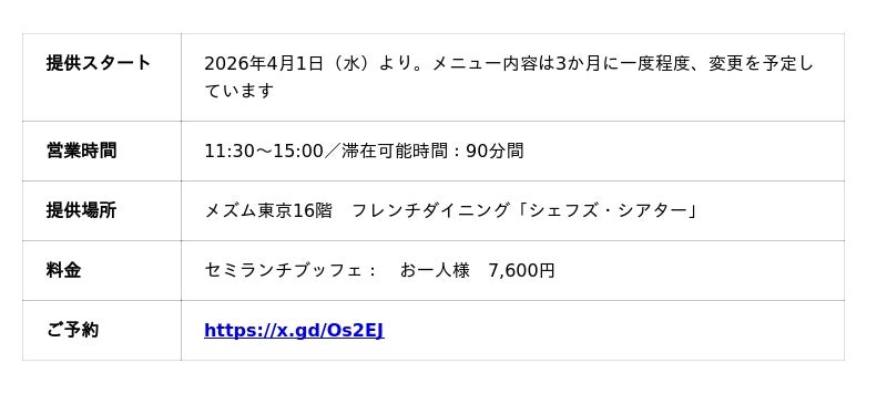 東京の躍動感や波長と共鳴し、上質な空間でクリエイティブな体験ができるモダンラグジュアリーホテル『メズム東京、オートグラフ コレクション』(港区海岸1-10-30/総支配人 生沼 久)は、2026年4月1日(水)より、新スタイルのセミランチブッフェ「トレトゥール・セミランチブッフェ」の提供を開始します。本ブッフェの導入に伴い、これまで提供してきたランチコースは3月31日(火)をもって終了し、4月1日(水)よりセミランチブッフェへと刷新します。