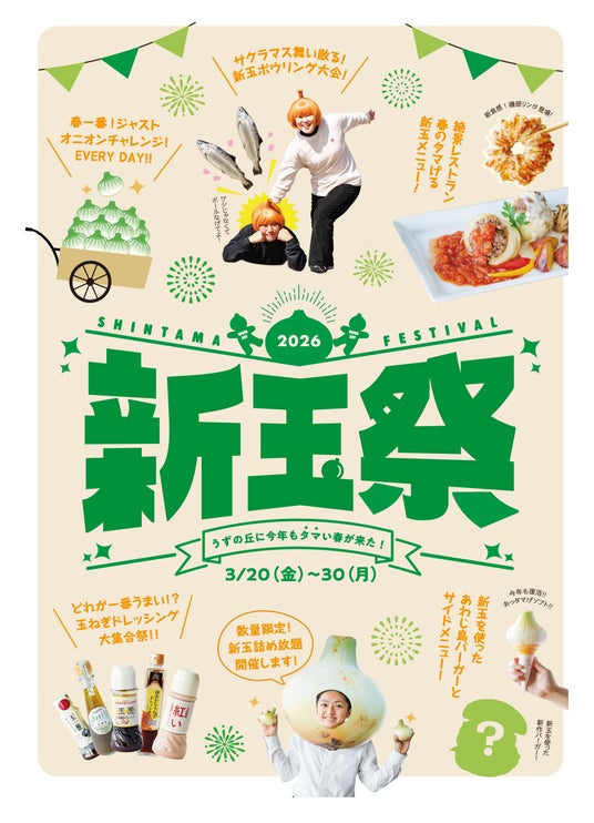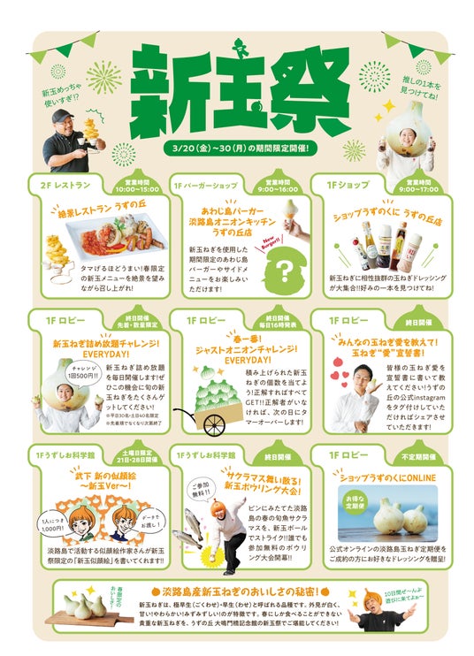 株式会社うずのくに南あわじが運営する「うずの丘 大鳴門橋記念館」では、春の地域特産品「淡路島新玉ねぎ」の収穫・販売時期に合わせて2026年3月20日(金)~3月30日(月)まで「新玉祭~うずの丘に今年もタマい春が来た!」を開催いたします。