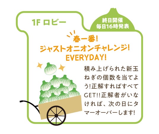 春一番!ジャストオニオンチャレンジ!EVERYDAY!(期間中毎日開催)積み上げられた新玉ねぎの個数を投票して当てよう!正解すれば新玉ねぎをすべてGET!!正解者がいなければ、次の日にタマーオーバーしていきます!