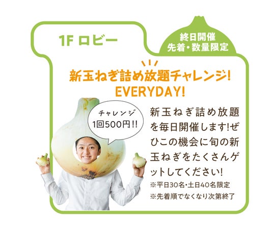 新玉ねぎ詰め放題チャレンジ!EVERYDAY!(期間中毎日開催)1回500円で旬の新玉ねぎ詰め放題にチャレンジ!お得に新玉ねぎをゲットできます。