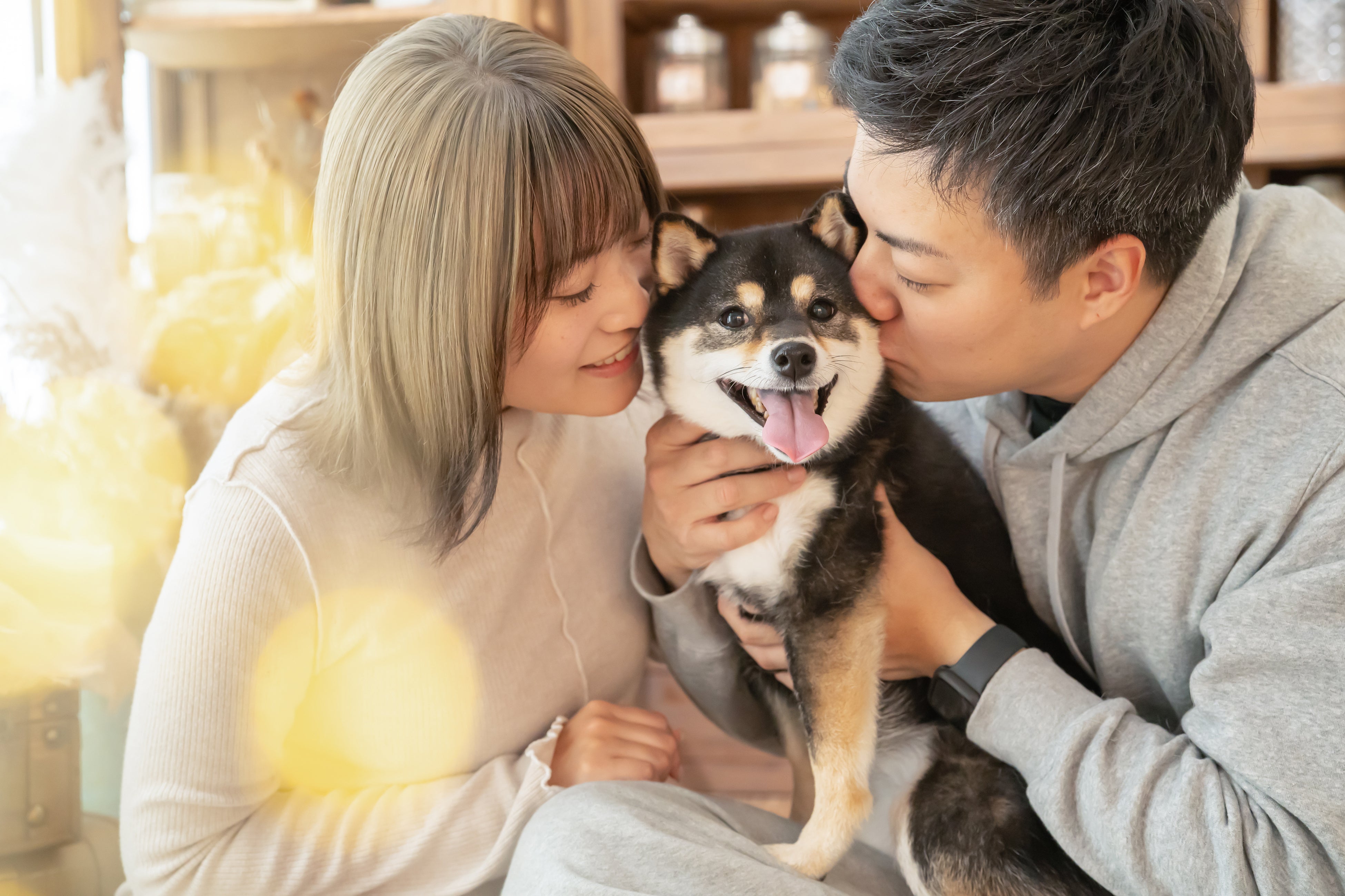 家族の一員であるわんちゃんと家族写真を