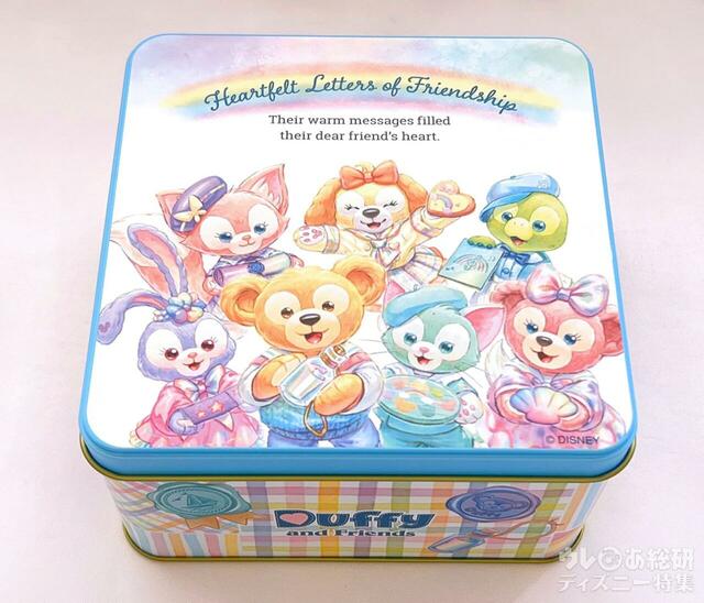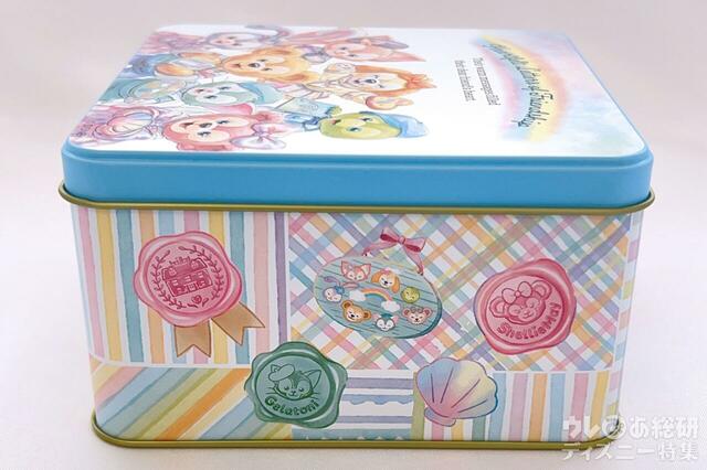 缶は、よく見るとダッフィーたちやロゴ、周りの小物の部分だけをツヤ出し加工しているので、角度によってはきらめく。とっても綺麗!
