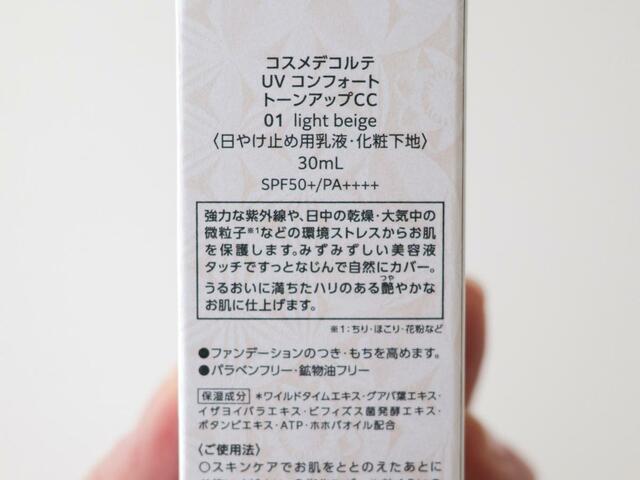 この多機能型日やけ止めシリーズ「UV コンフォート」、透明ジェルタイプなどもありますが、私が選んだのは色付きのトーンアップCCの「01 light beige」のカラー。