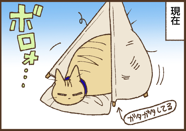 このテント、買った時もここの漫画に描いたのですが、あれから時間を経て今はこんな感じのボロ屋になりました(笑)。