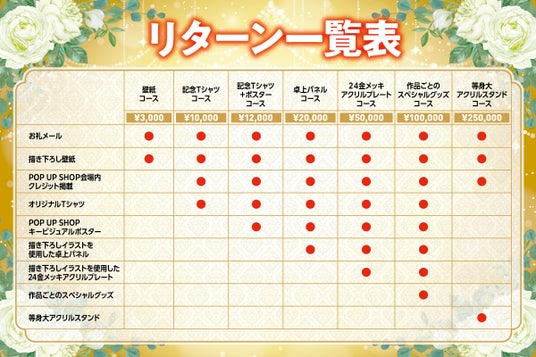 1名さま限定の描き下ろし等身大アクリルスタンドをはじめ、オリジナルTシャツなど、ここでしか手に入らない超限定のリターン品を各種ご用意しています。