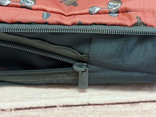 大きめのファスナーポケットには、見せたくない下着類が収納できて便利です。2つの区切りポケットには、ソックスやハンカチなどの小物を入れるのがおすすめ。