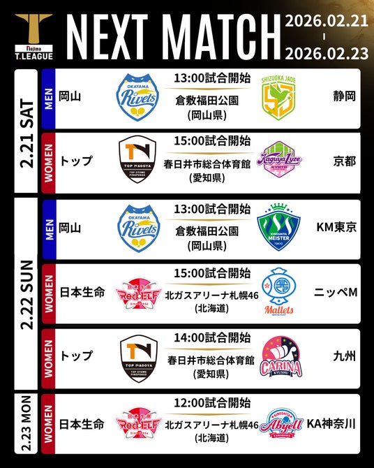 日曜の対戦となるKM東京は、この試合勝利をすればプレーオフ進出(レギュラーシーズン3位以内)が決まる。先週、Tリーグデビュー戦で勝利をあげたチャン ユーアンや、成長著しい川上流星といった若い選手達が大事な場面で起用があるかに注目したい。