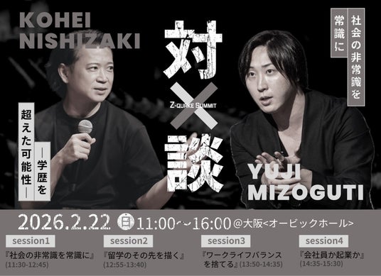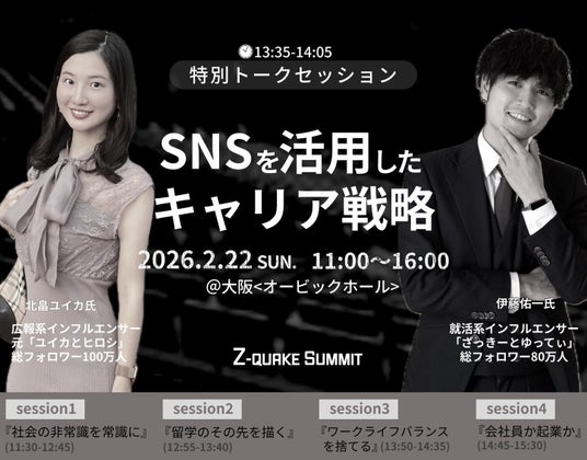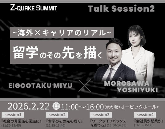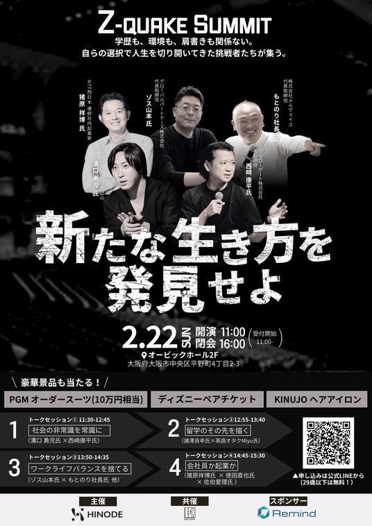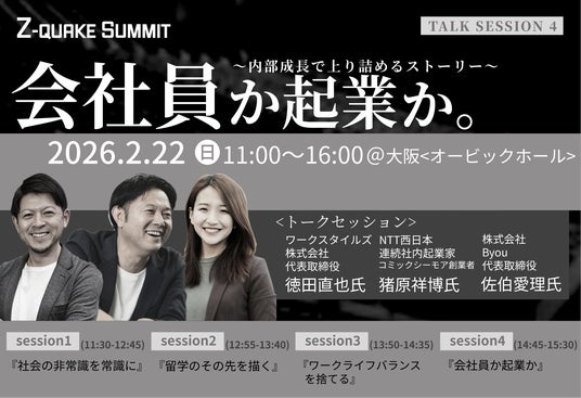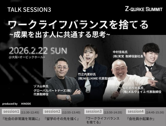 株式会社HINODE(大阪府大阪市 代表取締役:淀澤伸之)は、“関西Z世代底上げキャリアイベント『Z-QUAKE SUMMIT Vol.3』(以下ゼトクエ)を2026年2月22日(日)、オービックホール(大阪市中央区平野町4-2-3)にて開催いたします。 各業界トップランナー起業家のトークセッションや、Z世代によるピッチ、優良企業との交流ブースなど。