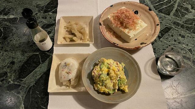 だだちゃ豆腐、ポテトサラダ(ポテト、ゆで卵、きゅうり、茹で豚、アーリーレッド)、しゃくし菜、千枚漬け。
