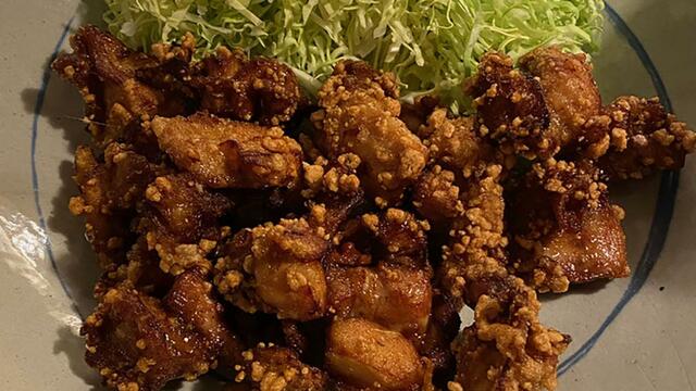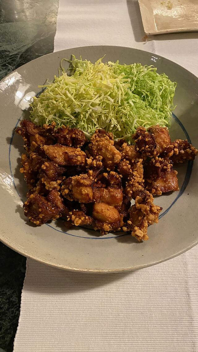 鶏肉の唐揚げ(白玉粉の塊がサクサクした食感を生んでいて美味しい。今度、白玉粉だけをつけた揚げ物にトライしてみよう)。