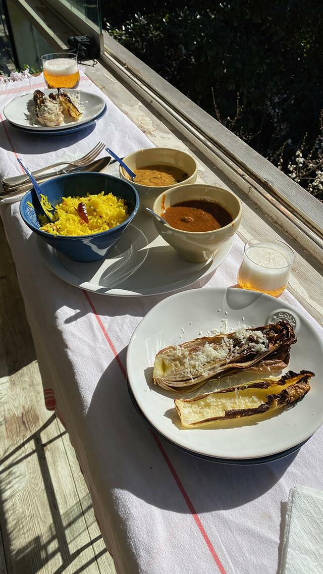 ラディッキオのグリル(パルミジャーノ)、エリック・サウスのカレー類(レモンライス、ほうれん草とチキン、マトンと青唐辛子)、