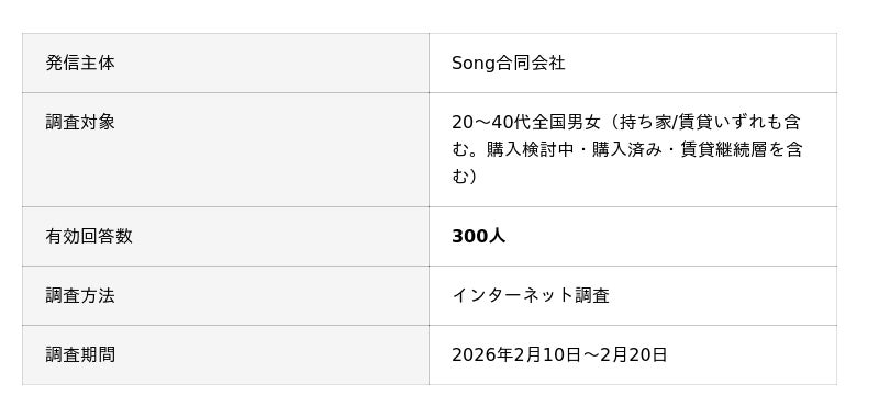 Song合同会社は、20~40代の全国男女を対象に「住宅は資産形成か、それともリスクか」に関する意識調査を実施しました。金利上昇局面の“体感変化”、共働き前提の返済設計、都心/郊外の価値観分断、修繕積立・管理費の“実負担”、中古×リノベの再評価、災害・保険・ハザード情報の意思決定影響、住み替え前提(売却・賃貸化)思考など、2026年らしい論点が分断を拡大。本リリースでは「資産形成派」「リスク派」「中間派(条件次第)」の三極構造を、データと当事者コメントで両論併記します。