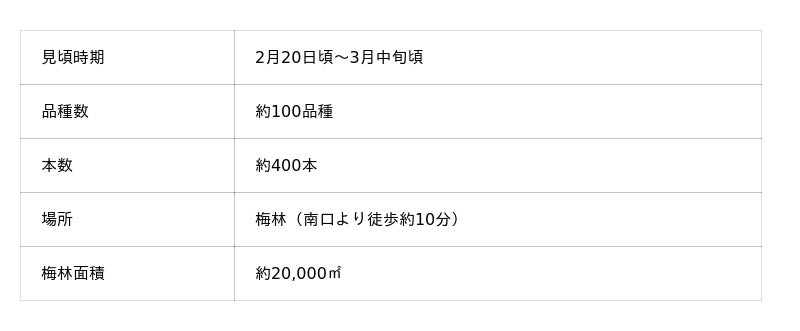 国営武蔵丘陵森林公園の「梅林」では、約100品種・約400本のウメが2月20日(金)に見頃を迎え、3月中旬頃までお楽しみいただけると予想しております。早咲きの紅梅は1月下旬から開花しましたが、品種数が多いことから季節が進むに連れて中咲き・遅咲きの品種が順次開花していくため、長期間にわたり花風景をご覧いただけます。「梅林」全体のウメが最も美しく、華やかに咲きそろう見頃の最盛期は2月末頃になると予想しております。「梅林」全体に漂うウメの香りと、白・桃・紅色の花風景に、春の訪れを感じてみてはいかがでしょうか。