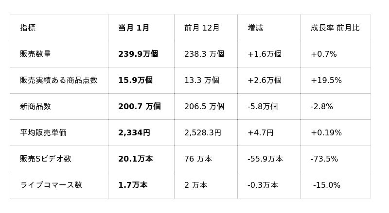 特に、ストレス解消グッズやインソール、スマホ関連アクセサリーなど、**即決性の高い価格帯(~2,000円前後)**の商品が堅調です。一方で、12月のセール反動を受け、伸び率にはばらつきが見られ、前年末特需型カテゴリーは調整局面に入った傾向がうかがえます。