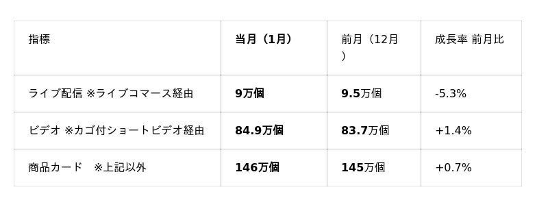 「スマホ・デジタル機器」は+1.9%と横ばい圏で推移しており、全体としては、嗜好性よりも実用性・日常消費型カテゴリーが選好される構造が鮮明となっています。また、上位カテゴリーでは引き続き動画経由の流入比率が高く、ショート動画主導型の販売構造が定着しつつある状況が確認されます。