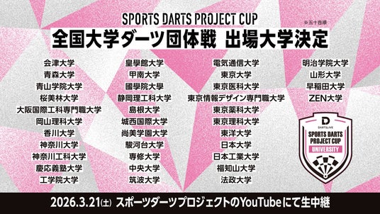 セガサミーグループの株式会社ダーツライブ(本社:東京都品川区、代表取締役 社長執行役員:阿部 東)が取り組むスポーツダーツプロジェクトは、2026年3月20日(祝・金)・21日(土)に全国の大学生・学生が集結する「スポーツダーツプロジェクトカップ2026」を、東京・品川にて開催いたします。