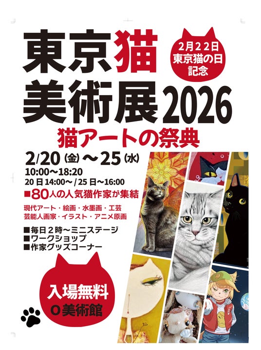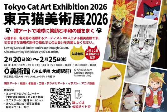 東京猫美術展(代表:鋤柄よし子〈雅号:妙雲〉/プロデューサー:國井一色)は、2026年2月20日(金)より25日(水)品川区立O美術館(JR大崎駅直結)にて「東京猫美術展2026」を開催中。