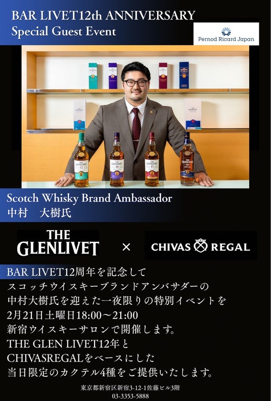 2026年2月21日(土)に「新宿ウイスキーサロン」にて、ペルノ・リカール・ジャパン スコッチウイスキーブランドアンバサダーの中村大樹氏をゲストに迎えた限定カクテルイベントを開催します。