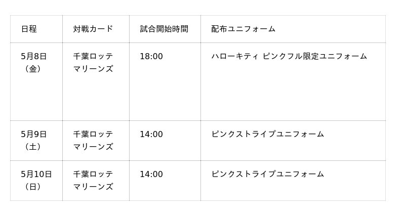 福岡ソフトバンクホークス株式会社(本社:福岡市中央区、代表取締役社長CEO:後藤芳光)は、2026年5月に開催する「ピンクフルデー」で入場者全員に配布するピンクフルユニフォームのデザインが決定したことをお知らせします。イベント初日の5月8日(金)はハーモニーランド35周年を記念した特別企画として「ハローキティ ピンクフル限定ユニフォーム」、5月9日(土)・10日(日)の2日間は「ピンクストライプユニフォーム」を配布します。(ビジター応援席は除く)ピンクフルデーは、野球観戦はもちろん、当日限定のさまざまな企画で誰もが”非日常”のエンターテインメントを楽しめるイベントです。また、乳がん検診の受診を啓発・推進する「ピンクリボン運動」を実施し、選手は3日間、ピンクリボンユニフォームを着用して試合に臨みます。チケットは2月28日(土)からホークス公式チケット購入サイト「タカチケット」にてステージ別先行抽選販売を開始します。