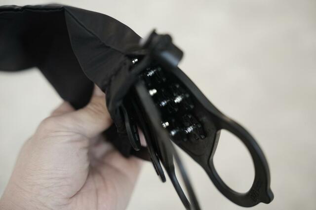 スパイクの金属面同士を内側に重ねるようにして入れるのがコツで、これを意識しないと鋭いスパイクでポーチを破ってしまう可能性があるため注意しましょう。