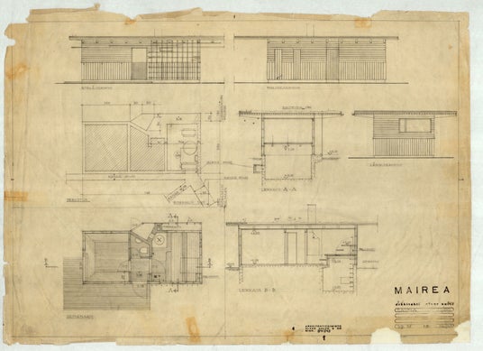 サウナの平面・立面・断面図 作図=アルヴァ・アアルト、1938、アルヴァ・アアルト財団蔵