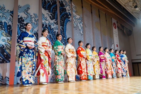 ミス日本コンテスト2026着物審査の様子(衣裳提供:三越伊勢丹 貸衣裳「グランジュール」、写真提供:一般社団法人ミス日本協会)