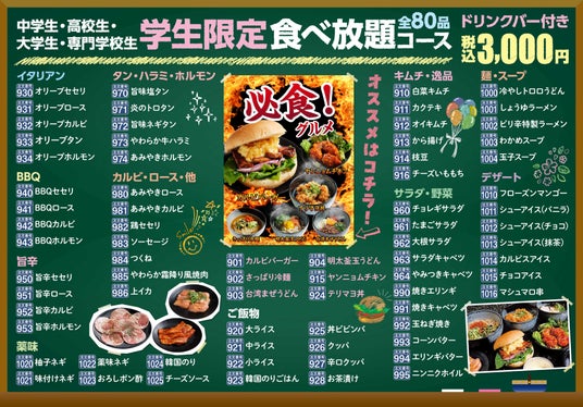 「学生限定 食べ放題コース 税込3,000円」※ ソフトドリンク飲み放題付き