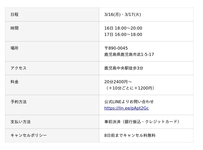 占い師養成CAMPの説明会と同時に、くるとん先生の対面鑑定も鹿児島で行います。すでにご予約いただきました方、誠にありがとうございます。くるとん先生が鹿児島で鑑定される貴重な機会になりますので、奮ってご参加ください。